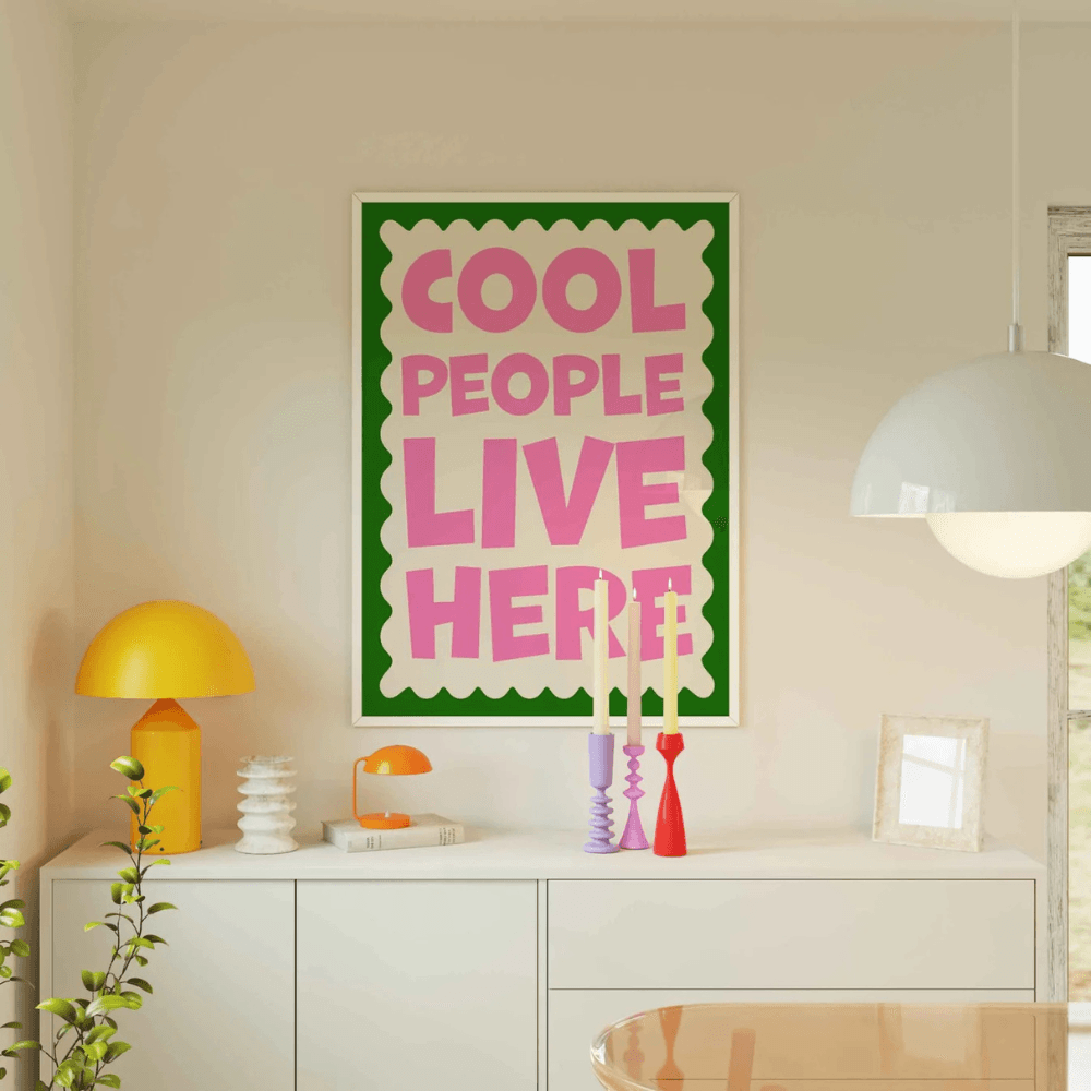 Un clin d’œil coloré pour les intérieurs qui ne se prennent pas (trop) au sérieux. Avec son typographique audacieuse et ses nuances vertes et roses rétro, l’affiche “Cool people live here” apporte une touche d’humour et de personnalité à ton mur. Parfaite seule ou en composition murale, elle affirme une seule chose : ici, on vit bien, on rit fort et on a du goût.