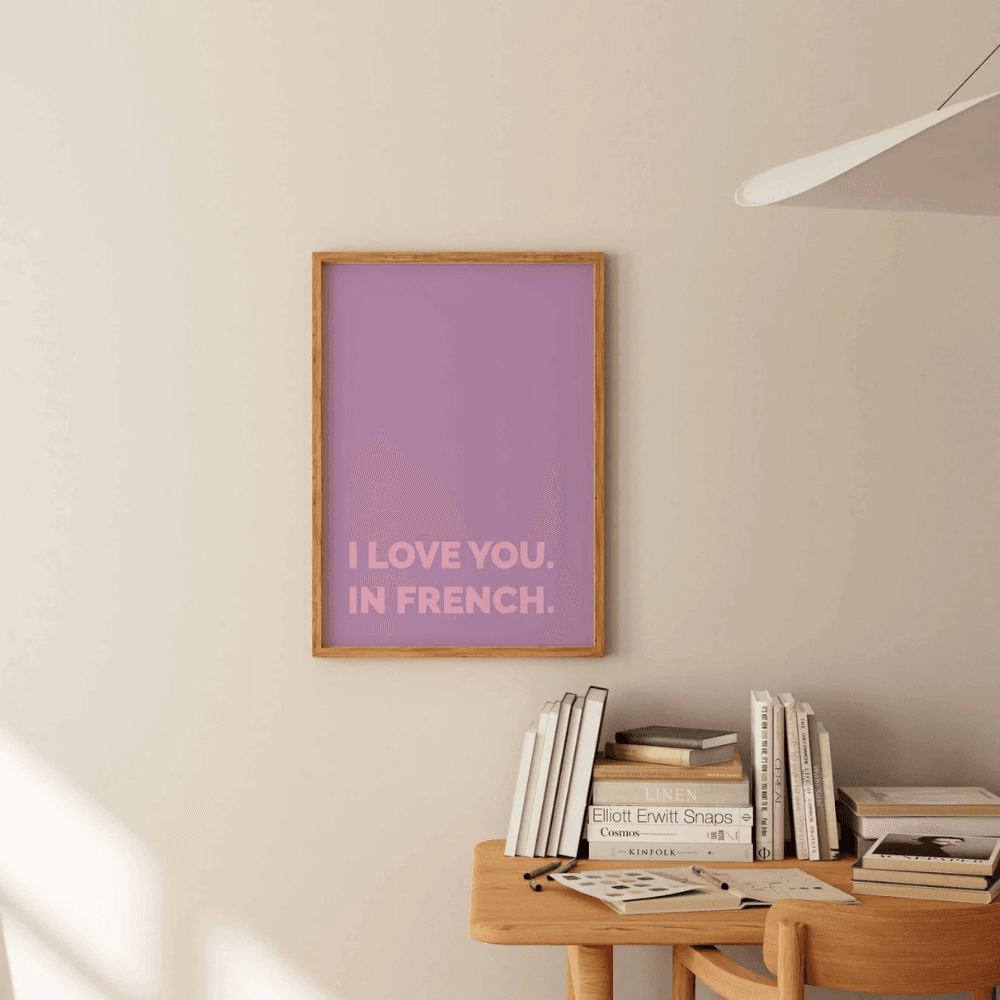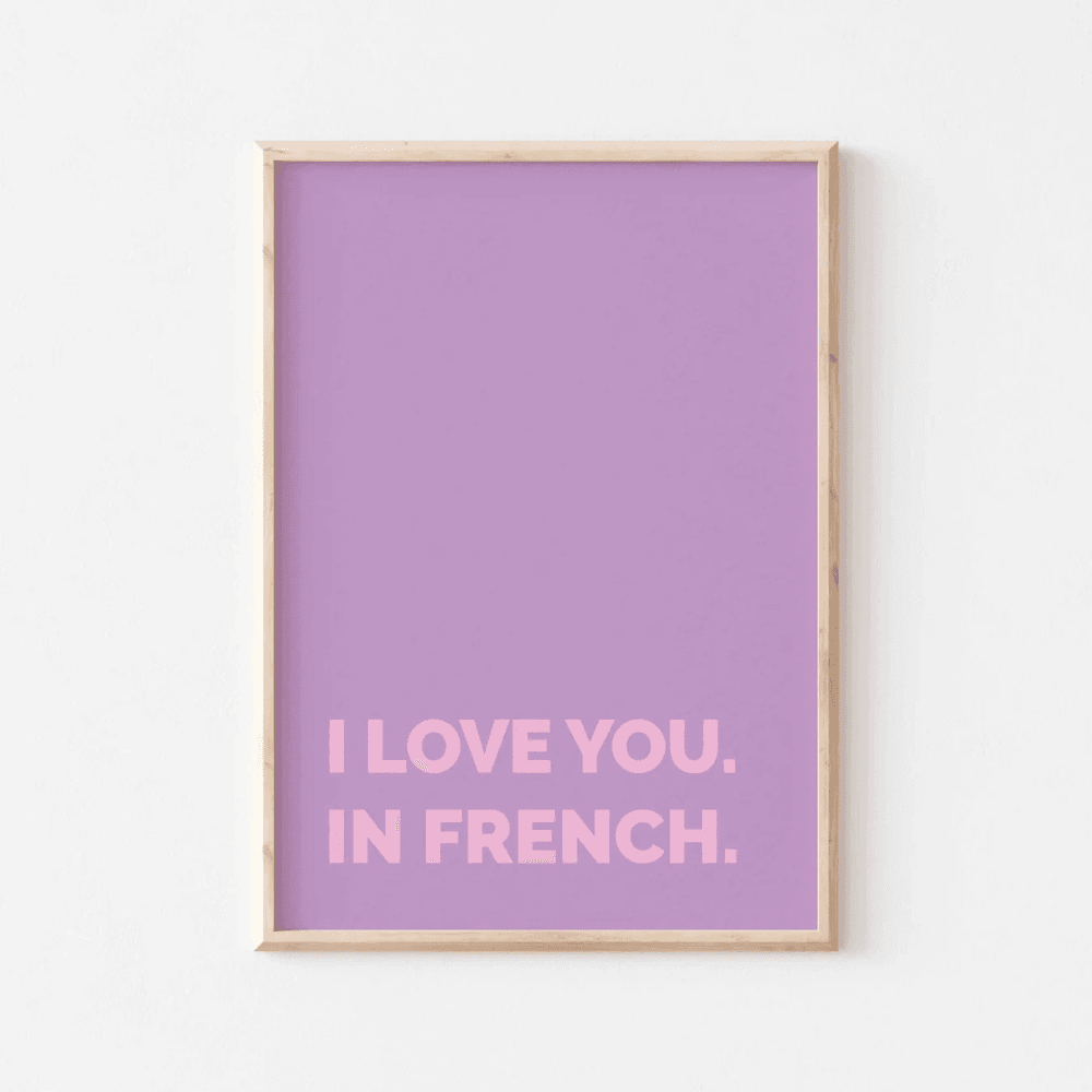 Une déclaration simple, mais qui fait son effet : “I love you in French”. Cette affiche joue sur le charme des mots et des couleurs avec son duo violet et rose, à la fois doux, moderne et un peu rétro. À offrir, à afficher, à relire — pour se rappeler qu’en français, même “je t’aime” sonne mieux.