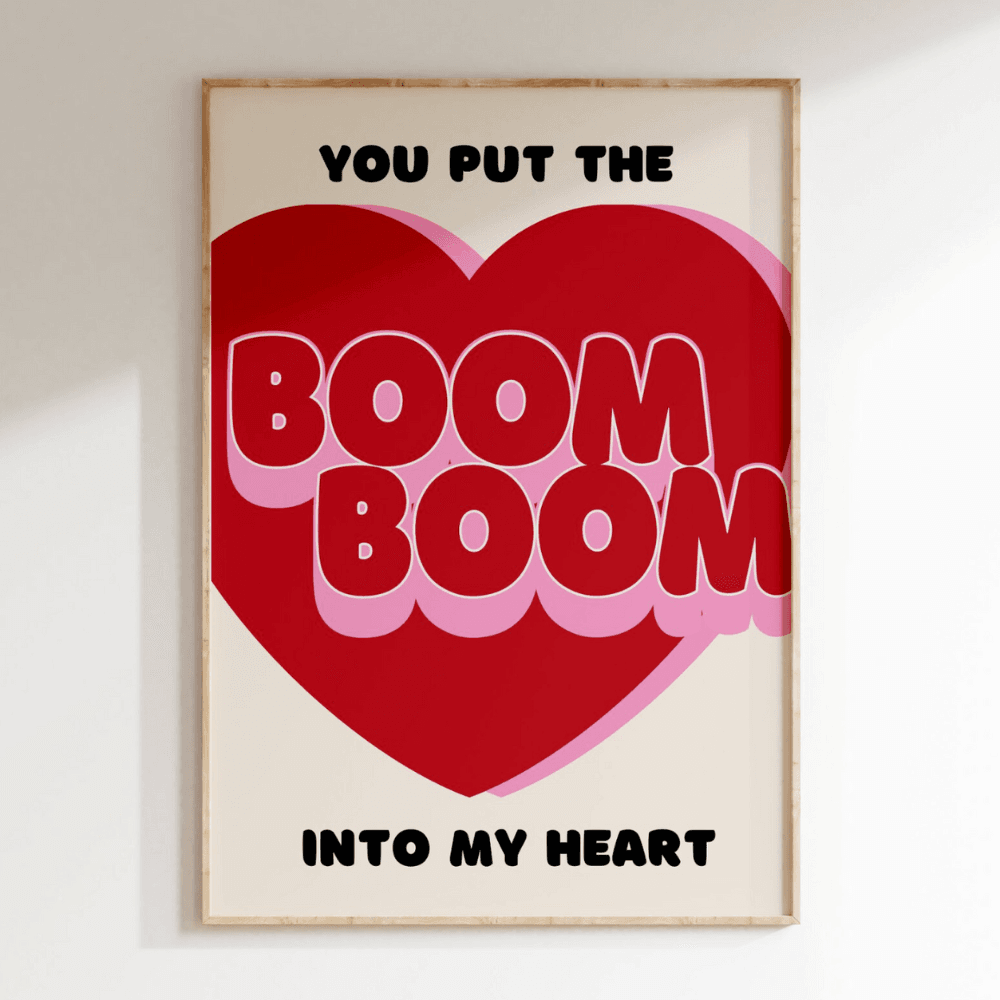 Faites battre le cœur de votre déco avec l’affiche “Boom Boom Into My Heart”, une création vibrante et pleine d’énergie. Avec ses couleurs vives, son cœur graphique et son esprit rétro-pop, cette affiche insuffle instantanément joie, amour et bonne humeur dans n’importe quelle pièce.