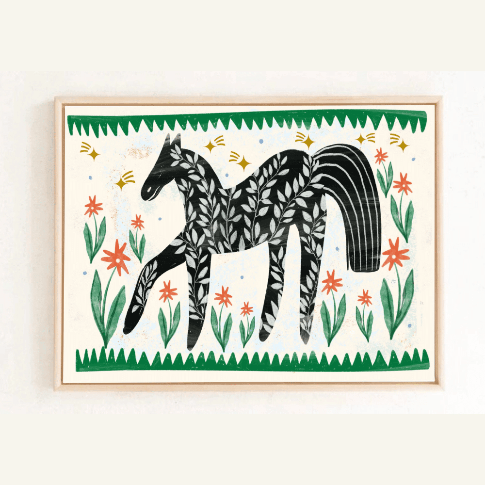 Affiche illustrée cheval noir et fleurs – Poster décoratif A4 | Twicy Store