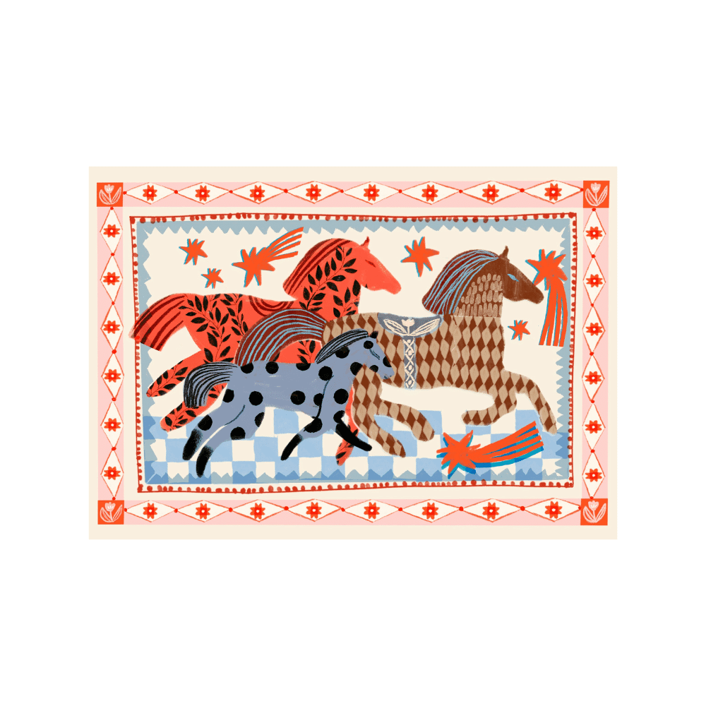 Apportez une touche artistique et dynamique à votre intérieur avec cette affiche illustrée représentant trois chevaux stylisés aux couleurs vives. Inspirée d’un univers graphique décoratif et folklorique, cette illustration mêle motifs géométriques, couleurs contrastées et composition narrative.