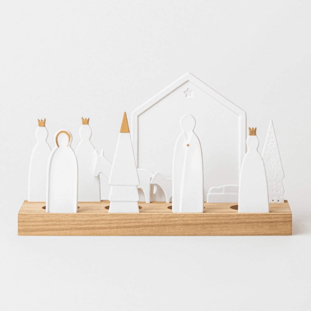 Ce bougeoir en bois d’acacias et porcelaine blanche non émaillée met en scène les silhouettes épurées de la Nativité — un décor délicat où se mêlent tradition et design contemporain.