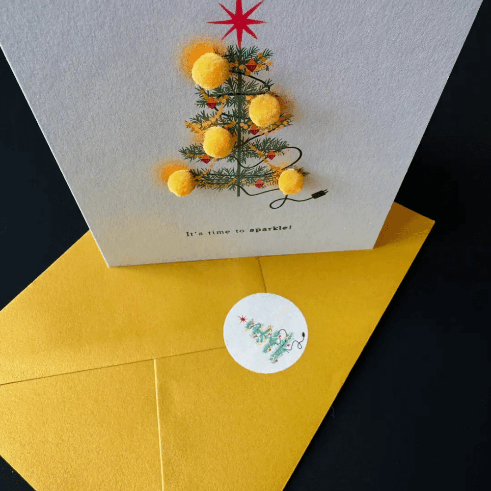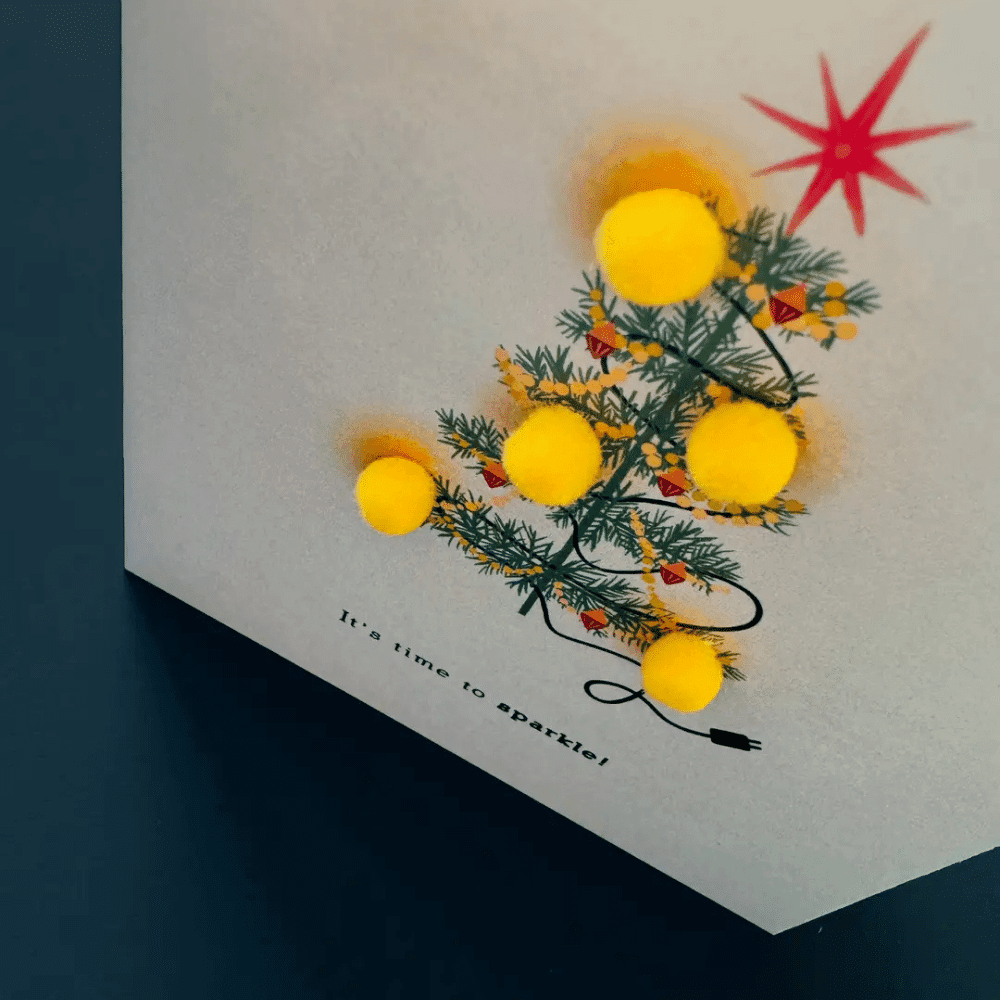Apportez une touche festive et raffinée à vos vœux avec la carte “Guirlande de Noël” décorée de pompons colorés. Son design met en scène une guirlande de Noël stylisée, rehaussée de petits pompons en relief qui ajoutent texture et originalité.