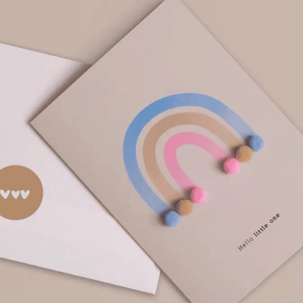 L’arc-en-ciel pastel, symbole d’espoir et de bonheur, est rehaussé par de petits pompons ludiques qui apportent de la texture et une touche de gaieté. Offrir cette carte, c’est transmettre un message chaleureux et personnalisé, idéal pour féliciter les jeunes parents ou accompagner un cadeau de naissance.