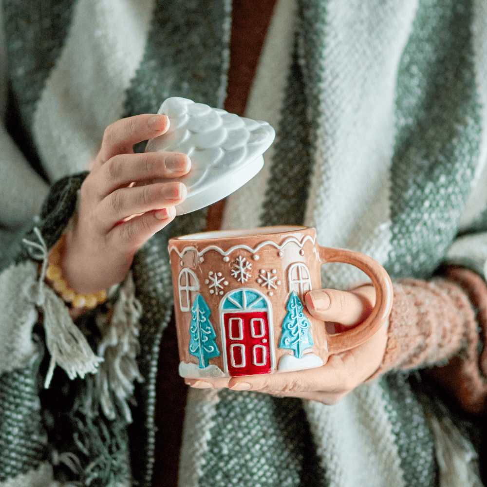Design unique : une maison pain d’épices enneigée, pleine de détails. Son couvercle permet de conserver votre boisson au chaud.