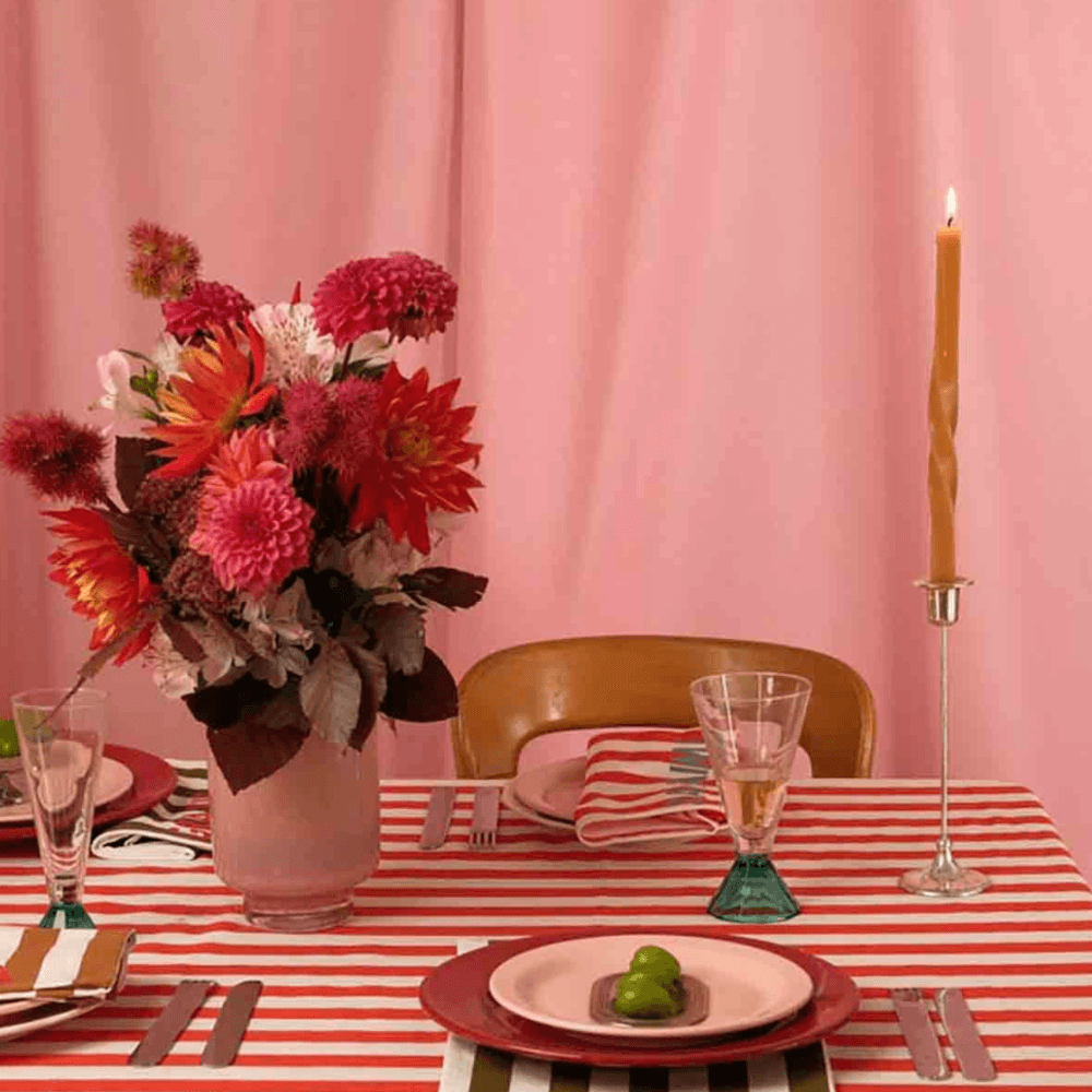 Apportez du rythme et de la convivialité à votre table avec cette nappe en coton à rayures cerise. Graphique et joyeuse, elle revisite les rayures dans une teinte rouge cerise lumineuse, parfaite pour créer une table chaleureuse, vivante et pleine de caractère.