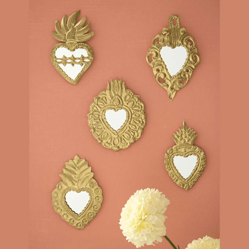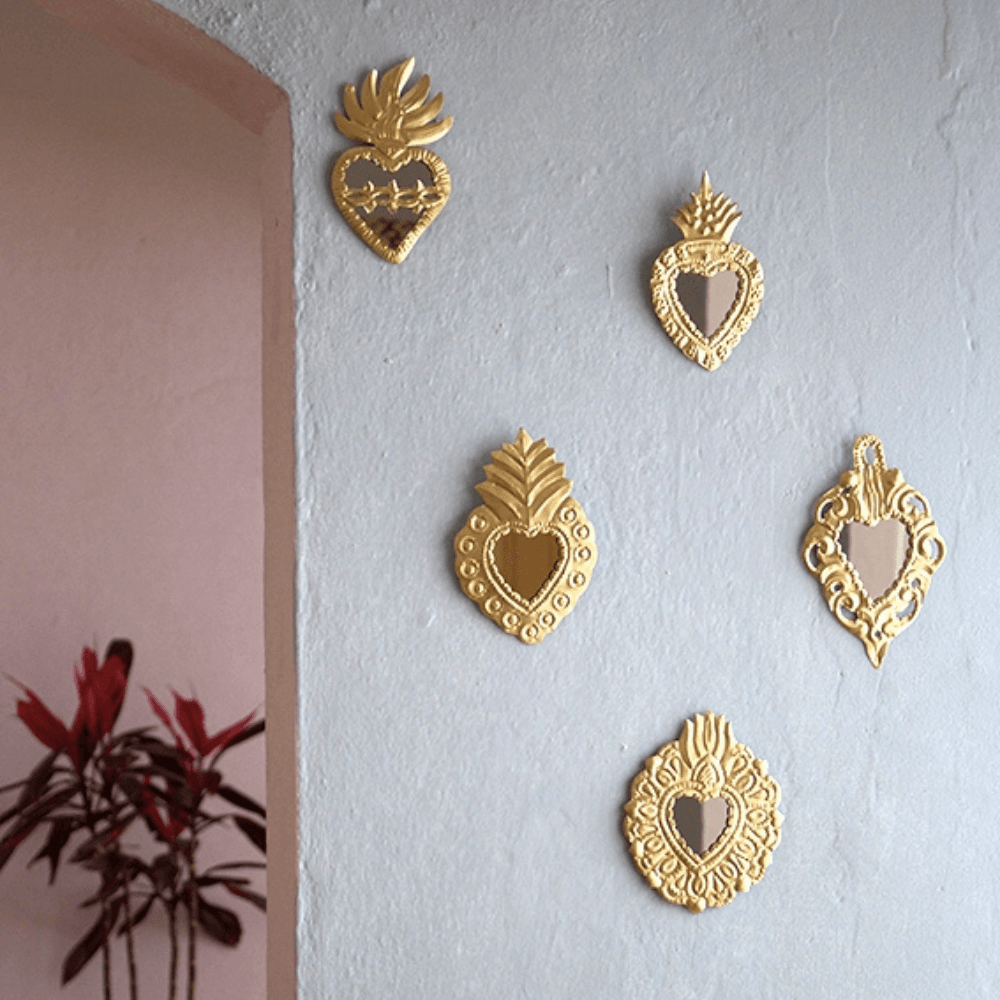 Illuminez vos murs avec ce lot de 6 cœurs sacrés dorés avec miroir, inspirés des ex-voto traditionnels mexicains. Chaque ornement est fabriqué et embossé à la main par des maîtres artisans à Oaxaca, au Mexique, perpétuant un savoir-faire ancestral issu de l’art populaire.